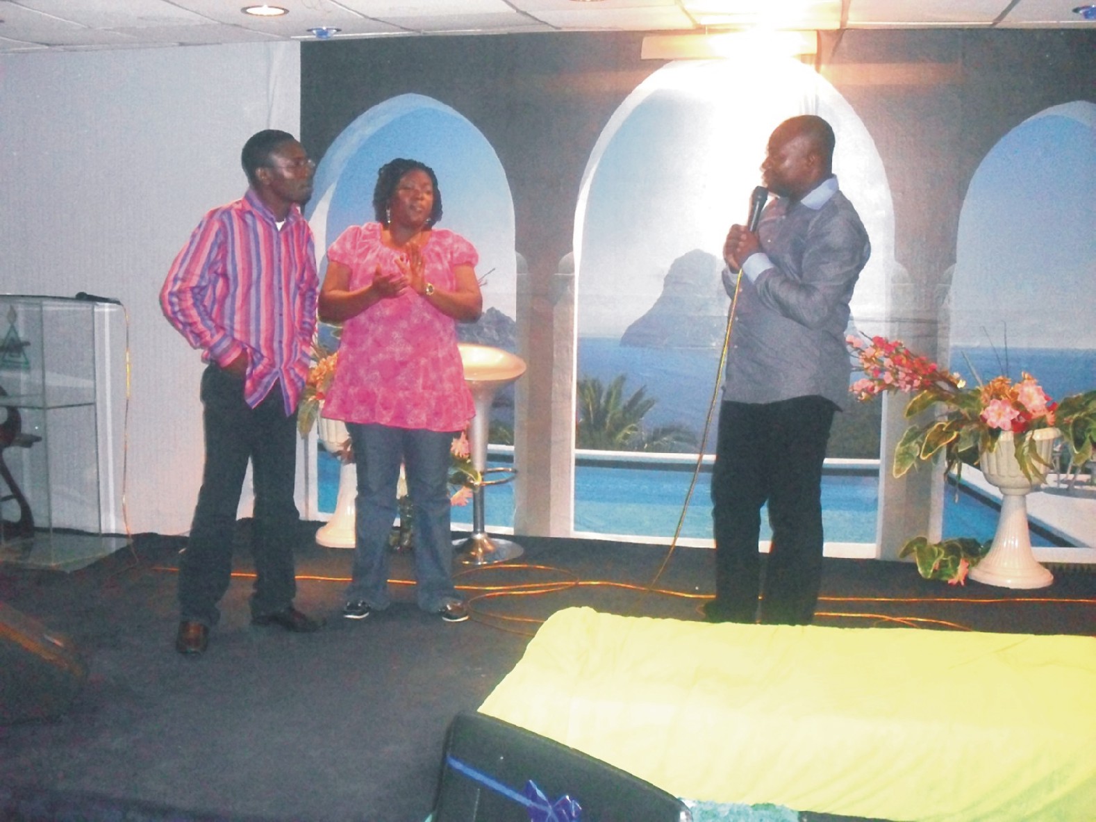 Pastor Isaiah presenting a gift (on the floor) to the Oyes