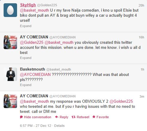 He has apologized to his fans for the tweet because many of his followers saw the act as a show off or something like that. But the issue is not going away. Now another fan has caused AY and fellow comedian BasketMouth to join issues over the same car gift.