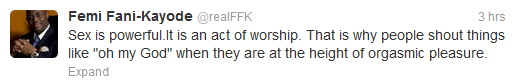 In recent times, I've got lots of complaint with regards to the "sex-capades" of former Minister of Aviation, Mr Femi Fani Kayode. Some of the allegations are just too scary to believe. But I started having a second thought about what people say about him when I read his tweet about sex.