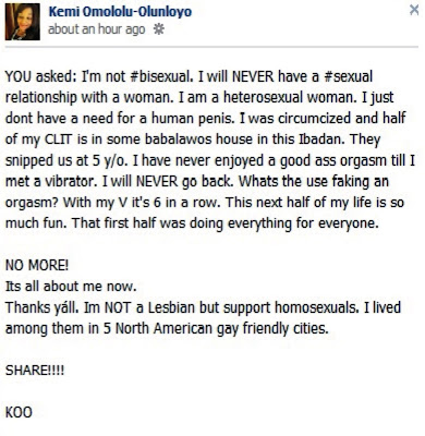 I said it before, Ms Kemi Olunloyo really needs some form of spiritual help. It appears no man is interested in her anymore in Ibadan because of her negative ways. Now she's claiming no man can satisfy her sexually so she has settled for a different kind of penis. See her shameless revelation below...
