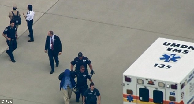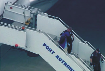 His hands were zip-tied behind his back as he was led out of the flight onto the tarmac, where several police vehicles and ambulance were waiting. He was wearing a dark hooded jacket and a blue shirt.