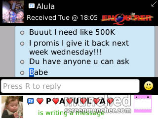 Why would I send unclad pictures of me to someone who is married, or engaged, or whatever? And by the way this Tim, you are talking, about, I don’t know him! The person I know, that came to our house is called Bode, who says he runs pattern music or so, and yes we had something, I just loved his accent, the way he talks to me at night and all that, but then my parents said they didn’t want me to have anything to do with him, and I stopped seeing him! I even deleted him off my BB contacts. Look I know you are just making up these stories, because I didn’t send any pictures to anybody. So you can do what you like, I don’t care. And please don’t even call me again. In fact I dare you to do anything!”