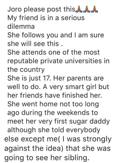 A university student is to have been on her period for 13 days now after following a sugar daddy in a bid to make money and live "big girls" lifestyle. The sad story...