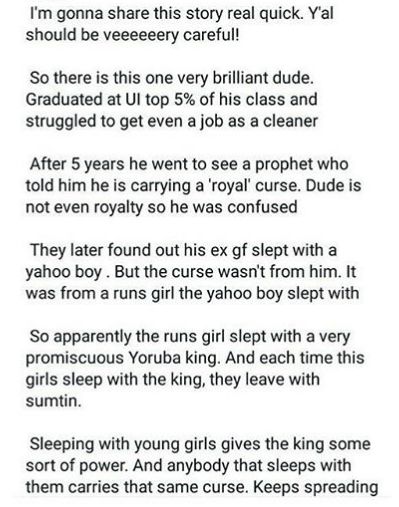 The man you want to open your legs for because of money, do you know how many ladies he has done same with? Do you know the kind of spirit in those ladies? As a man, the lady you're in a hurry to sleep with because she has 'assets', do you know how many men she has opened her legs for? Do you know what some of those men do for money in secret?