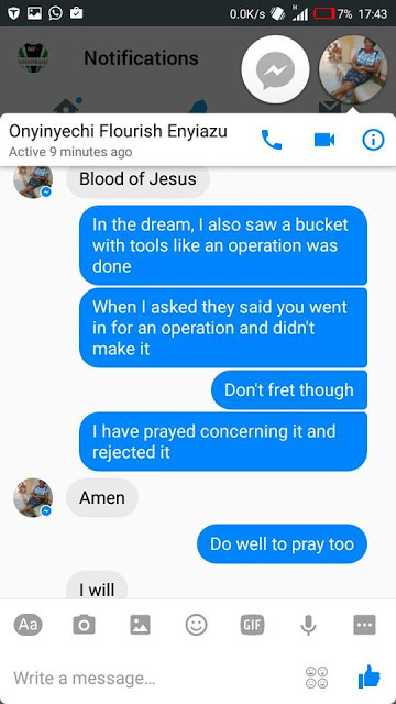 "It's really unfortunate that the spiritual controls the physical. John Kpoobari Diidi had a revelation about Onyinyechi Flourish Enyiazu, he inboxed her and they had the conversations. Who would have thought the dream was going to be real? Yesterday she uploaded that she had a successful surgery and today she is no more, that revelation John had has come to pass.
