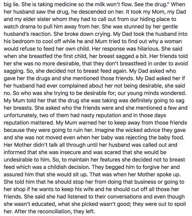 Here's a story about a Nigerian lady who first refused to breastfeed her baby because it will make her breasts sag, then dumped her husband, son and newborn baby weeks after the man she claimed to love lost his bank job. She absconded with other men. *Smiles*
