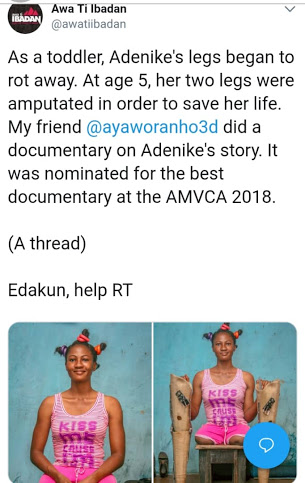 "As a toddler, Adenike's legs began to rot away. At age 5, her two legs were amputated in order to save her life.