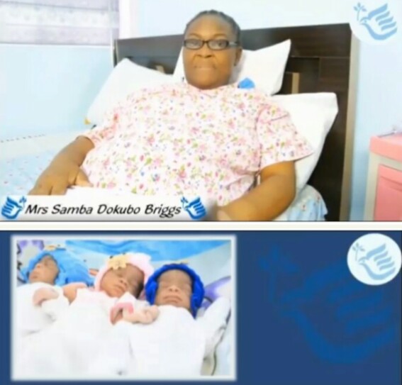 The excitement of family and friends is out of this world as the woman pictured above, Mrs Samba Dokubo Briggs delivers triplets (2 boys and a girl) in Port Harcourt at the age of 62.