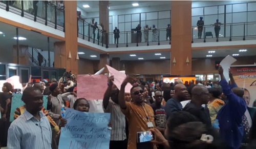 The workers, who went as far as blocking the deputy senate president, Ike Ekweremadu from accessing his office, held placards bearing inscriptions such as ‘Omolori is a contractor’ ‘killing staff with poor condition of service’ and ‘constitute the National Assembly commission now.’