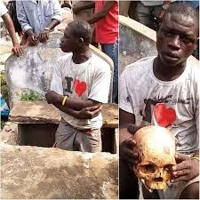 The man pictured above was caught in the early hours of yesterday digging out a human skull out from the grave for money ritual...