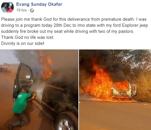 One of the pastors, Evangelist Sunday Okafor, explained that he was travelling to Imo state for a program in his Ford explorer SUV along with two other pastors on Friday, December 28th, when the fire broke out from his seat.