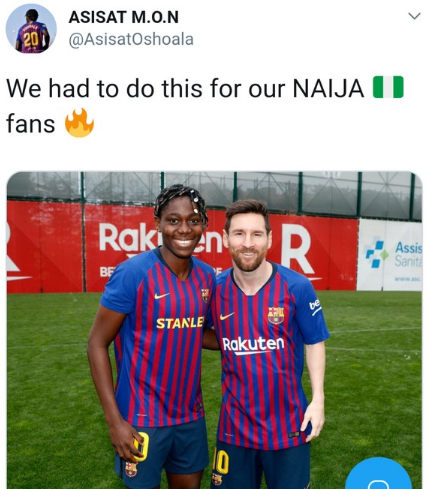 Nigeria's leading female footballer Asisat Oshoala has been under pressure from social media fans to take a picture with Lionel Messi, since she moved to Barcelona female team. She's granted their wish.