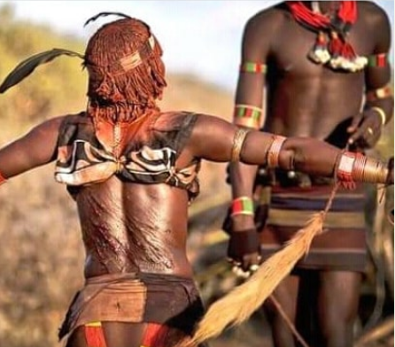 Who invented this kind of culture and to achieve what purpose? Women from the Hamar tribe in Ethiopia are whipped to show their love for men going through Rite of Passage ceremony. The beatings go on until their backs turn bloody. They are not allowed to scream.